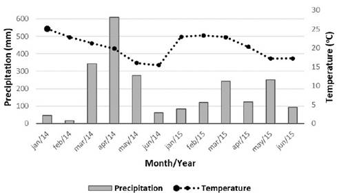 Figure 1: Monthly rainfall and temperatures observed during the study period.