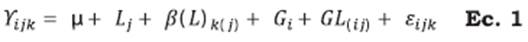 donde, Υijk = variable respuesta del i-ésimo genotipo, en la j-ésimo ambiente, en el k-ésimo bloque, μ = media general del experimento, Lj = efecto del j-ésimo ambiente, β(L)k(j) = efecto del k-ésimo bloque, en el j-ésimo ambiente, Gi = efecto del i- ésimo genotipo, GL(ij) = efecto de la interacción del i-ésimo genotipo por el j-ésimo ambiente, εijk = error experimental asociado con la observación Υijk.