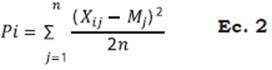 donde, Pi = parámetro de estabilidad del genotipo i, Xij = variable respuesta del i-ésimo genotipo en el j-ésimo ambiente, Mj = respuesta máxima observada entre todos los genotipos en el ambiente j, n = número de ambientes.
