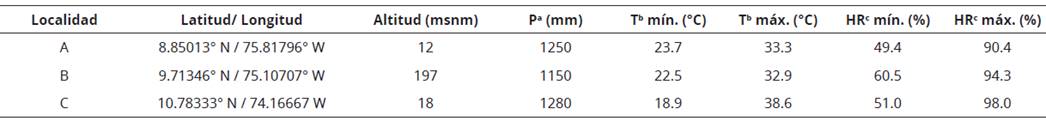 El estudio se realizó en tres centros de investigación (C.I.) (ambientes) de la Corporación Colombiana de Investigación Agropecuaria - AGROSAVIA en la región Caribe de Colombia, en la zona de vida Bosque seco Tropical (bs-T) (Holdridge, 1967) (Tabla 1). El primero se encuentra en el C.I. Turipaná, municipio de Cereté, departamento de Córdoba; el segundo en la Sede El Carmen de Bolívar (municipio de El Carmen de Bolívar, departamento de Bolívar); y el tercero en el C.I. Caribia, en el municipio de Zona Bananera, departamento del Magdalena.