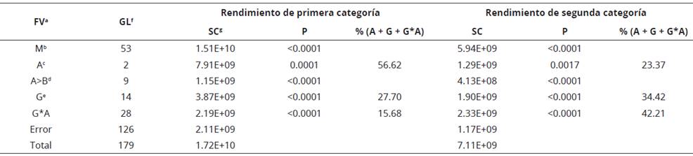 Al realizar la descomposición en valores y vectores singulares de la matriz de IGA para el rendimiento, se encontró que el primer componente representó 58.38 y 85.14% de la varianza contenida en esta interacción para los rendimientos de primera y segunda categoría, respectivamente.