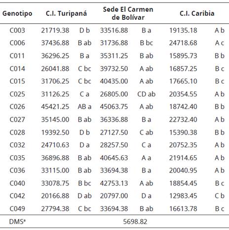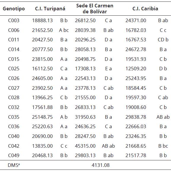El genotipo C026 se destacó significativamente (P < 0.05) por presentar el mayor rendimiento de frutos de primera categoría (tipo exportación) en las localidades de C.I. uripaná y Sede El Carmen de Bolívar sin diferenciarce significativamente entre estas (P > 0.05), mientras que, los genotipos C006, C035, C011, C027, C036 y C040 alcanzaron comportamiento superior en el C.I. Turipaná y C040, C035, C015 y C014 en la Sede Carmen de Bolivar (Tabla 3), con rendimientos entre 33078.75 y 45421.25 kg/ha. No obstante, se identificaron siete genotipos tipo exportación que se diferenciaron significativamente en el C.I. Caribia, con rendimientos entre 19135.19 y 24718.68 kg/ha, pero, con una productividad significativamente inferior (P < 0.05) a la obtenida en las localidades de C.I. Turipaná y Sede El Carmen de Bolívar.