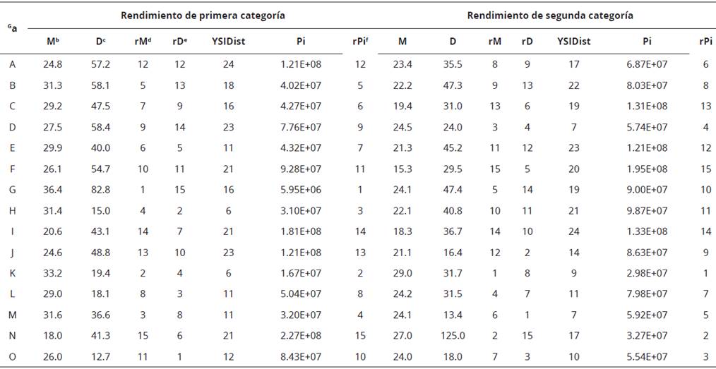 Igualmente es posible identificar genotipos con el mayor rendimiento y más estables, según el índice de estabilidad de rendimiento (YSIDist) (Figura 3 y 4, y Tabla 5), entre ellos: C015, C027, C035, C036 y C040 para el rendimiento de primera categoría y C014, C035, C036, C040 y C049 para el rendimiento de segunda categoría. En este mismo sentido, los genotipos que aparecen como los más estables, según el parámetro Pi para el rendimiento de primera categoría son: C006, C026, C027, C035 y C040, y para segunda categoría: C014, C035, C040, C042 y C049 (Tabla 5), entre ellos: C014, C027, C035, C040 y C049, que coinciden con los genotipos más estables y de mayor rendimiento de acuerdo al índice YSIDist, donde el parámetro Pi integra el rendimiento medio y la estabilidad relativa en un solo parámetro, al igual que el índice YSIDist (Vargas et al., 2016).