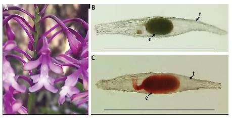 Figure 1: Epidendrum barbaricum flower and seeds. (A) E. barbaricum flower. (B) E. barbaricum not viable seeds. (C) E. barbaricum viable seeds. Bar scale = 1mm. t: seed coat; e: embryo.