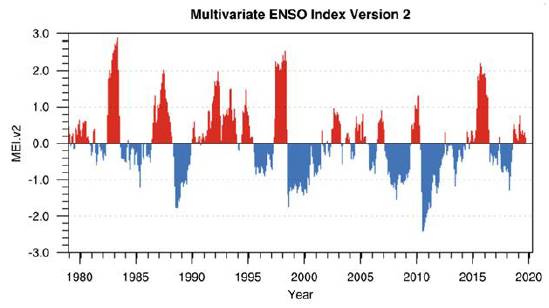 Figure 1: Temporal oscillation of the MEI index (Multivariate ENSO Index), indicating the occurrence of El Niño (red) and La Niña (blue) phenomena. Source: <https://www.esrl.noaa.gov/psd/enso/mei/>.