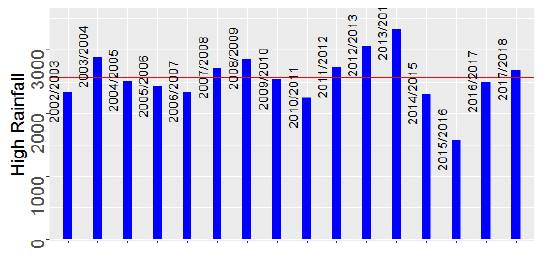 Figure 2: Rainfall in the target region of the study (Paranorte, Juara-MT) in sixteen years of evaluation (2002 to 2018). Accumulated rainfall in each of the sixteen years studied. The red horizontal line marks the average for all years (2562 mm).