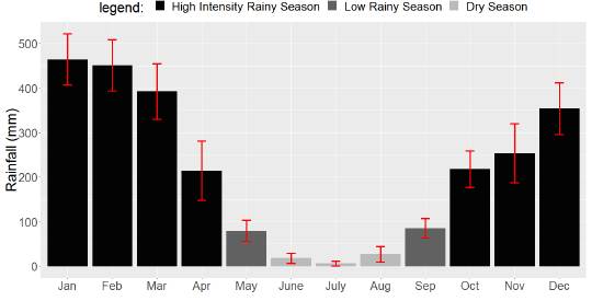 Two distinct seasonal periods were identified, according to accumulated monthly precipitation, with a 95% reliability. The year can be divided into a dry and a rainy season. The rainy season runs from September to May, with low rainfall , and October to April with high rainfall
