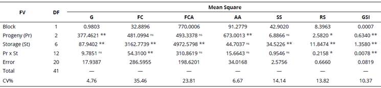 The variables FC, RS and GSI showed significant difference in progeny interaction and storage periods by analysis of variance (Table 1), but did not show different averages between progenies by Tukey test at 5% probability (Table 2), thus it was made the average of these three progeny in Table 4, for to better display the seven periods responses that were evaluated. Significance was observed for the periods for all variables, except AA, and the responses were presented in each storage period (Table 4).