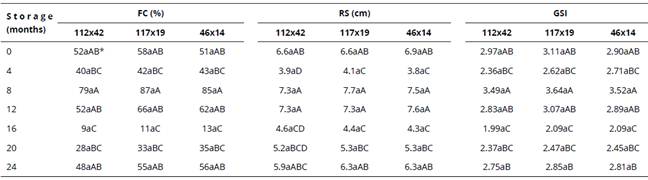 In the progeny interaction with the storage period there was significant difference for FC, RS and GSI (Table 1). Table 2 shows that even though there was a significant difference by the analysis of variance, the means test showed no difference between the three progenies, proving the efficiency of the breeding program in adding favorable characteristics to the seeds of all evaluated progenies.