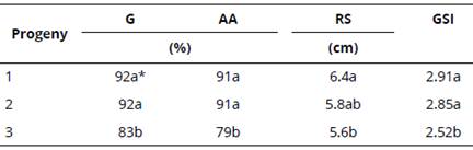The analysis of variance showed a significant difference between the means of the progenies for G, AA, RS and GSI. For the averages of the period, it was significant for G, FC, FCA, SS, RS and GSI (Table 1).