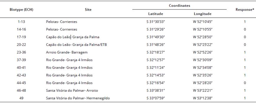 *Biotypes selected according to the response (visual) 0 = susceptible and 1 = resistant that exhibited the following responses to imazapyr+imazapic (73.5+24.5 g a.e. ha-1): ECH1 (Biotype 1) = 10% control., ECH14 (Biotype 14) = 98% control; ECH27 (Biotype 27) = 10% control; ECH38 (Biotype 38) = 5% control and ECH 44 (Biotype 44) = 90% control.