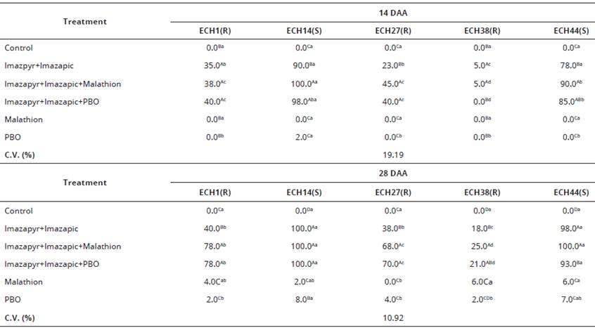 Table 2: Control (%) at 14 and 28 days after application (DAA) of resistant (ECH1, ECH27 and ECH38) and susceptible (ECH14 and ECH44) Echinochloa crusgalli (barnyardgrass) var. mitis biotypes to the imazapyr+imazapic (73.5+24.5 g a.e. ha-1), applied alone or preceded by the application of malathion (1000 g a.i. ha-1) or PBO (525 g a.i. ha-1. Capao do Leao/RS, Brazil.