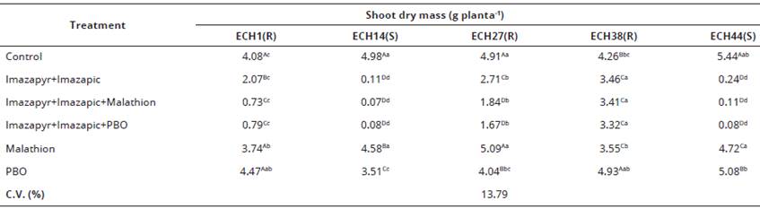 Shoot dry mass results (Table 3) presented significant dry matter reduction when the inhibitors preceded herbicide application compared to application of the herbicides alone on the resistant ECH1 and ECH27 biotypes.