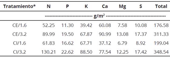 El manejo de la solución nutritiva con base en la concentración individual de iones del lixiviado (CI) mostró una mayor necesidad N, P y K; por el contrario, mientras el manejo con CE mostró un mayor requerimiento de Ca y Mg, en ambos niveles de 1.6 y 3.2 dS/m. El incremento de 1.6 para 3.2 dS/m mostró un incrementó en la aplicación final de todos los macronutrientes (Tabla 1).