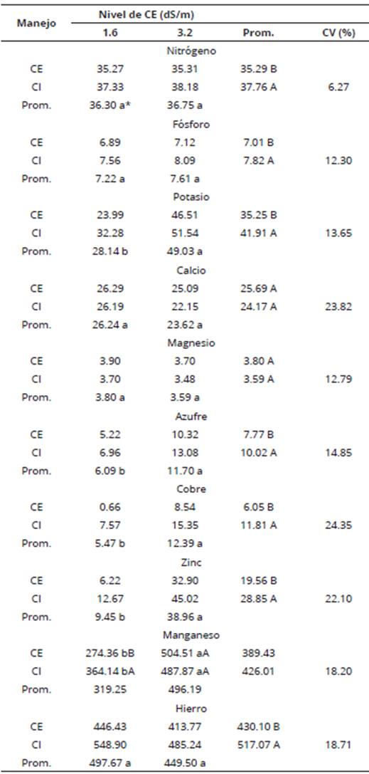 El aumento en el nivel de iones elevó los contenidos de Cu, Zn, Mn y Fe (Tabla 2). Excepto para Zn, que presentó un contenido más bajo que el óptimo en el nivel 1.6 dS/m. De acuerdo con Campbell (2013) el contenido de Cu fue adecuado y Fe y Mn fueron excesivos, independiente del manejo o del nivel inicial en la solución nutritiva.