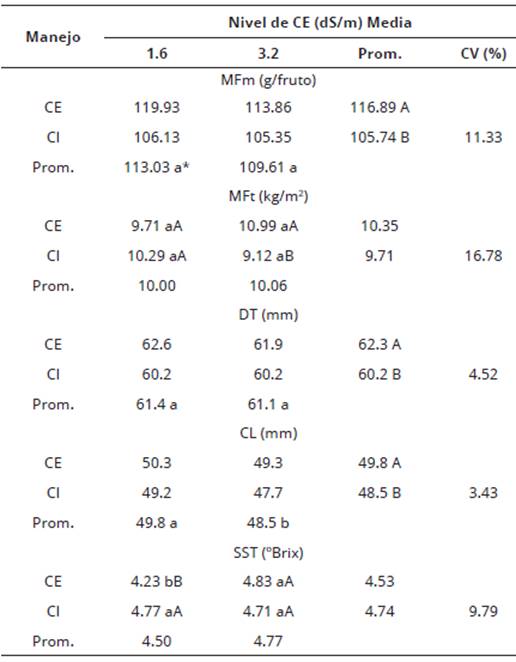 El promedio de la masa fresca del fruto (MFm), el diámetro transversal (DT) y la longitud del fruto (L) fueron mayores con el manejo de la solución utilizando la CE, que también proporcionó una mayor productividad de masa fresca total (MFí) cuando fue asociado con el nivel de 3.2 dS/m (Tabla 3). A pesar de la superioridad (P < 0.05) del manejo CE para las variables relacionadas con el tamaño de los frutos, se observó que los aumentos no fueron tan diferenciados, siendo 10.5% para MFm, 3.3% para DT y 2.9% para L (Tabla 3). Los valores promedio obtenidos fueron menores que el promedio del potencial del hibrido, especialmente para MFm, que puede alcanzar 200 g. La obtención de frutos más grandes fue limitada por la alta densidad poblacional (Streck, Buriol y Schneider, 1996) y el espacio reducido entre líneas (Wamser et al., 2009), factores de manejo de cultivo que elevan la productividad en detrimento del tamaño de los frutos. El aumento de la productividad con el manejo CE en el nivel de 3.2 dS/m fue aproximadamente de 20.5% en comparación con el manejo CI, pero este incremento no estuvo relacionado con el estado de nutrición de las plantas, ya que los contenidos de nutrientes en las hojas fueron generalmente más altos en el manejo CI y estuvieron dentro del rango de adecuado para ambos tratamientos.