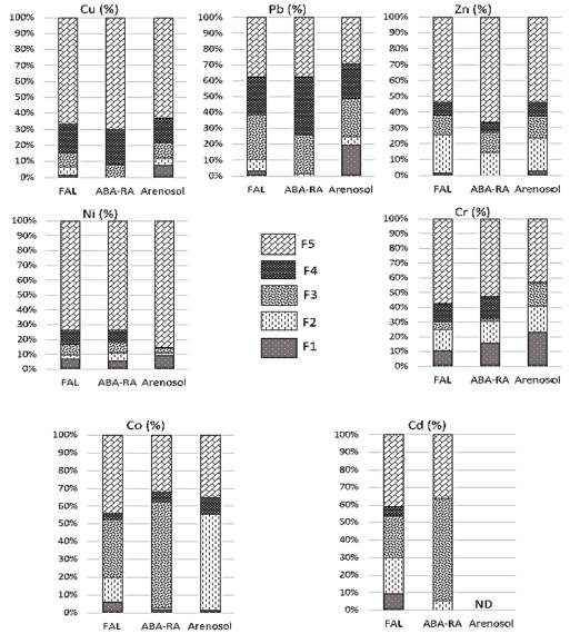 Figura 2: Fracciones de los metales Cu, Pb, Zn, Ni, Cr, Co y Cd en los suelos: FRAL-Ferralítico Amarillento Lixiviado, ABABA-Alítico de Baja Actividad Arcillosa Rojo Amarillento. F1 fracción soluble en agua, F2 fracción ácido soluble, F3 fracción reducible ligada a óxidos de hierro y manganeso, F4 fracción oxidable unida a la materia orgánica y F5 fracción residual. ND- no detectado.