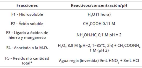 Posteriormente se tomó 1 g de suelo y se realizó la extracción secuencial según el método BCR descrito por Ure et al. (1993) adicionando la fracción hidrosoluble. Las muestras blanco (testigo) sin adición de suelo fueron analizadas empleando el procedimiento anterior para cada etapa de análisis en tres repeticiones. El procedimiento utilizado, los reactivos y las cinco fracciones obtenidas se incluyen en el Tabla 2.