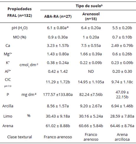 aValores promedios ± desviación estándar. * Letras diferentes en la fila indican diferencias significativas (P≤ 0.05). bFRAL- Ferralítico Amarillento Lixiviado, ABA-RA- Alítico de Baja Actividad Arcillosa Rojo Amarillento. CIC- capacidad de intercambio catiónico.