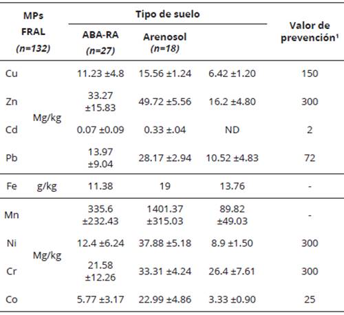 Con excepción del contenido de Co en el suelo ABA-RA (23 mg/kg), en los demás este metal presentó valores diferentes al valor de prevención (25 mg/kg). El Cd es el metal de menor concentración en el suelo con valores < 1 mg/kg. En este suelo se presentaron valores superiores en todos los casos, lo que puede ser debido a que no obstante tener una textura similar a los demás, presenta un contenido mayor de arcilla. Además, exhibe valores ligeramente más elevados de Fe y Mn. Según Amaral-Sobrinho et al. (2009) los óxidos de Fe y Mn tienen un efecto significativo en la absorción de los MPs.