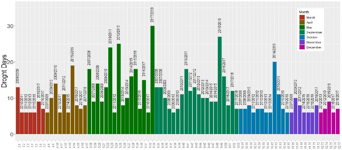 Figure 4: Months and years with occurrence of drought in the rainy season, as well as their duration, in number of dry days (precipitation not exceeding 5 mm). The evaluation period comprises eleven years (2007/2008 to 2017 / 2018).