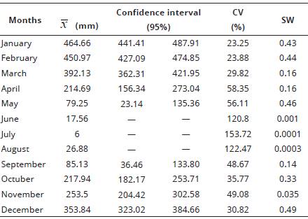 : estímate of rainfall average; CV: coefficient of variation (%); and SW is the p-value test of Shapiro Wilk (5%).