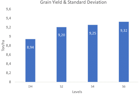 The least square means for grain yield at the different levels (Table 4) were further visualized in Figure 1, which showed the standard deviation for each level.