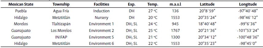 The DH laboratory, greenhouse, and fields are at the Agua Fría Experimental Station, and the nursery is in Metztitlán, State of Hidalgo, Mexico. The line by tester evaluations were conducted in four representative subtropical environments at elevations of 900 - 1800 meters above sea level during the second semester of 2016, as shown in Table 1.