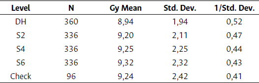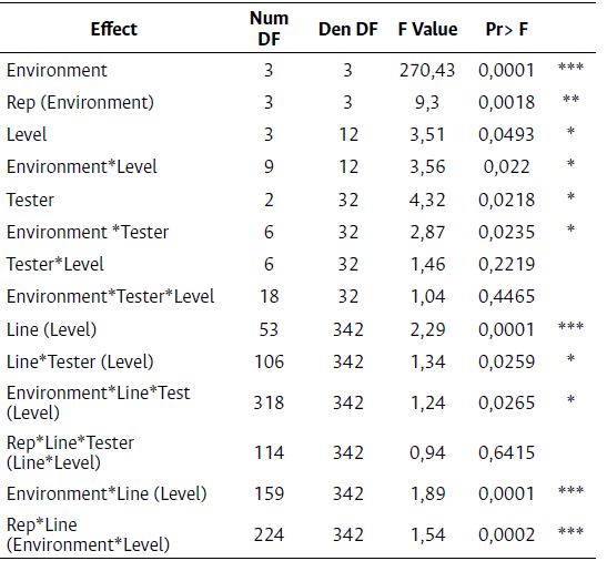 Second step: The response variables were weighted through the PRECISION variable in the Equation 2, using the HPMIXED procedure. To adjust the degrees of freedom, the lines were nested within the levels.