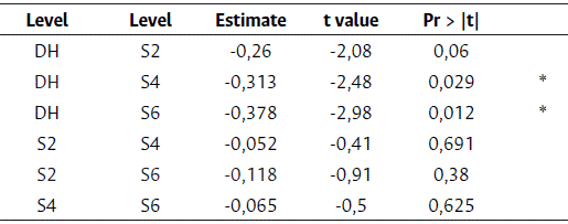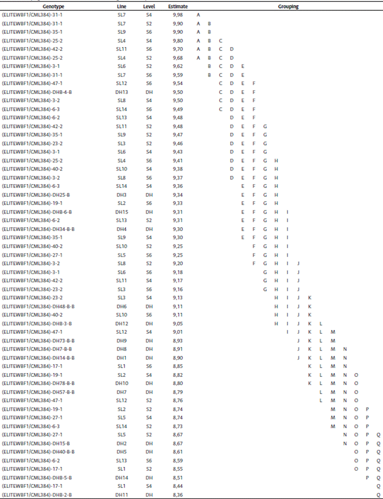 The HPMIXED procedure compared the levels as shown in Table 4. The results showed a statistically significant difference between DH and S4 and between DH and S6. However, there were no significant differences between selfing generations. Based on this comparison, three groups were identified: group A, made of S6 and S4; group AB, consisting of S2; and group B, comprising the DH.