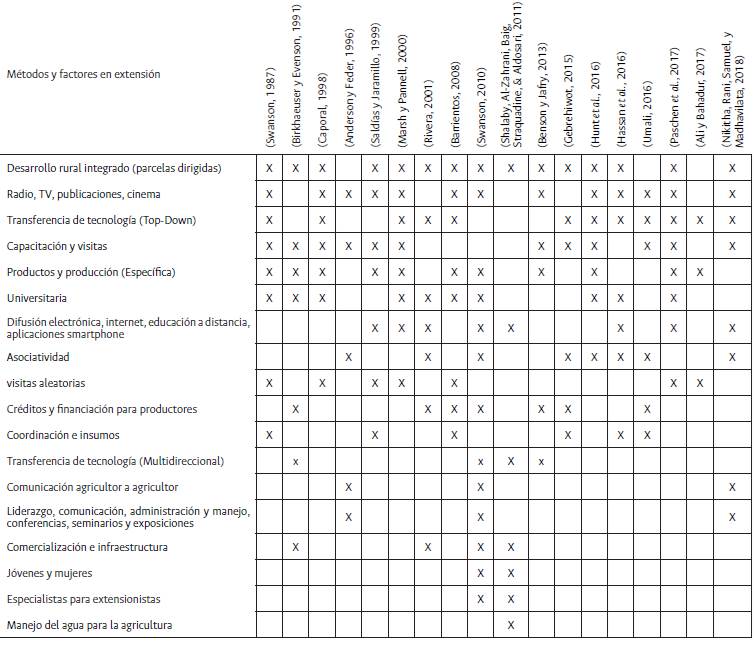 Métodos y factores en extensión agropecuaria. La búsqueda sistemática de documentos relacionados con la extensión agropecuaria en bases de datos de publicaciones científicas (Scopus, Science Direct, Redalyc y Scielo) y la información revisada en organizaciones del sector agropecuario arroja 158 documentos relacionados con extensión agropecuaria. En 18 de ellos se identifican los métodos y factores para poder atender la extensión agropecuaria (Tabla 1). Un método mencionado con frecuencia corresponde a la transferencia de tecnología, usándolo para llevar la investigación hasta el productor a tráves del extensionista como menciona Caporal (1998) en Brasil, Barrientos (2008) en Argentina y Ali y Bahadur (2017) en Pakistan.