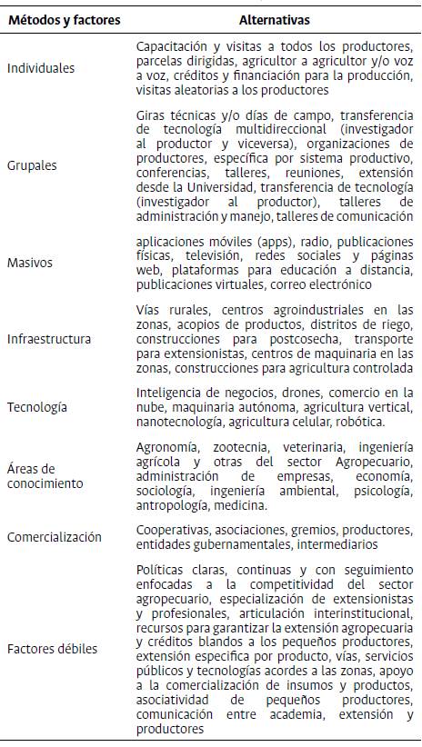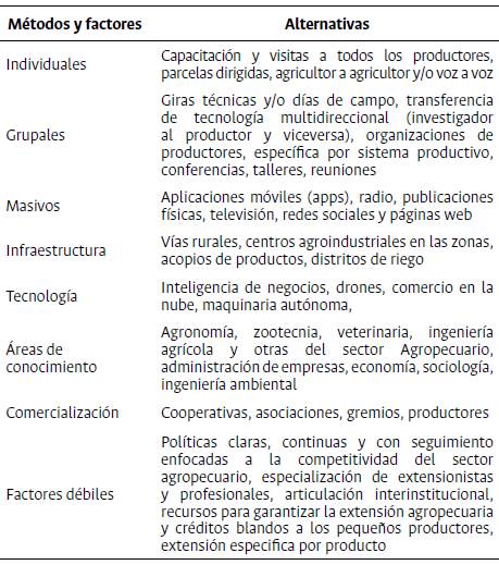 De la tabla anterior se establecen métodos que podrían generar mayor fortalecimiento e innovación en los pequeños productores y los factores necesarios y débiles para mejorar en extensión agropecuaria. (Tabla 2).
