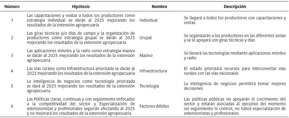Con el consenso generado a través de las dos rondas Delphi con los expertos, se establecieron hipótesis a futuro asociadas a métodos individuales, grupales, masivos, factores necesarios en infraestructura, tecnología y factores débiles en extensión agropecuaria (Tabla 4).