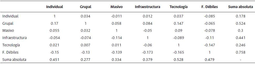A partir de la matriz de elasticidad de las hipótesis planteadas, se observa que la variable que más influye sobre las demás son los factores débiles con un valor de 0.758, seguida por métodos grupales con 0.524, representando una diferencia de 31 %. El factor necesario con mayor dependencia fue la tecnología con 0.528, seguida de factores débiles con 0.479, mostrando una diferencia de 9 %, por lo tanto, las variables anteriores son estratégicas para la visión de futuro.