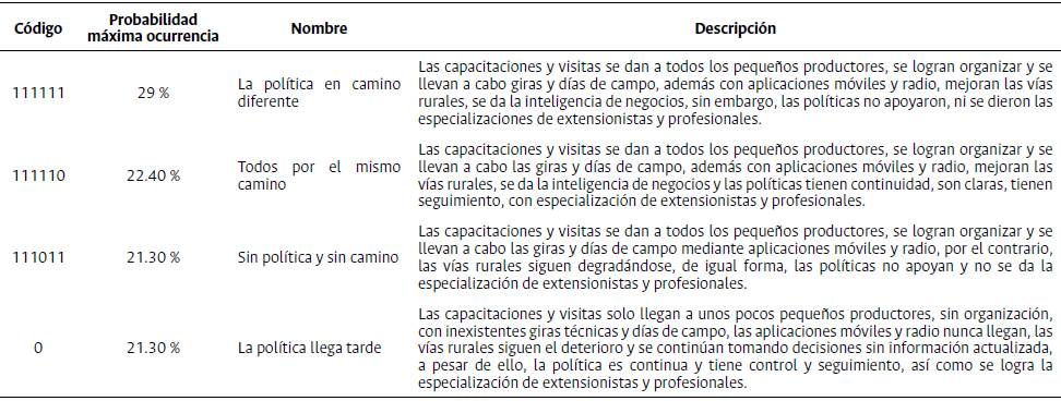 Los escenarios por cada grupo analizado se asocian a las seis hipótesis planteadas en la tabla 2, donde uno (1) establece la ocurrencia y cero (0) la no ocurrencia. Desde este punto de vista, se define como escenario probable (111111-La política en camino diferente), escenario apuesta (111110-Todos por el mismo camino), escenarios indeseados (111011-Sin política y sin camino) y (000000-La política llego tarde) (Tabla 6).