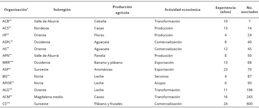 Con el propósito de considerar en el estudio la diversidad organizacional, cultural y productiva, se seleccionaron tres cooperativas y 10 asociaciones ubicadas en siete subregiones del Departamento de Antioquia en los municipios de: Belmira, Guadalupe, Santo Domingo, Maceo, San Vicente Ferrer, Rionegro, El Carmen de Vivoral, Caramanta, Andes, Girardota, Barbosa, Liborina y Cañasgordas; orientadas a diversos sistemas de producción (leche, plátano, aguacate, flores, frutales, cacao, cebolla y panela), como se indica en la Tabla 1.