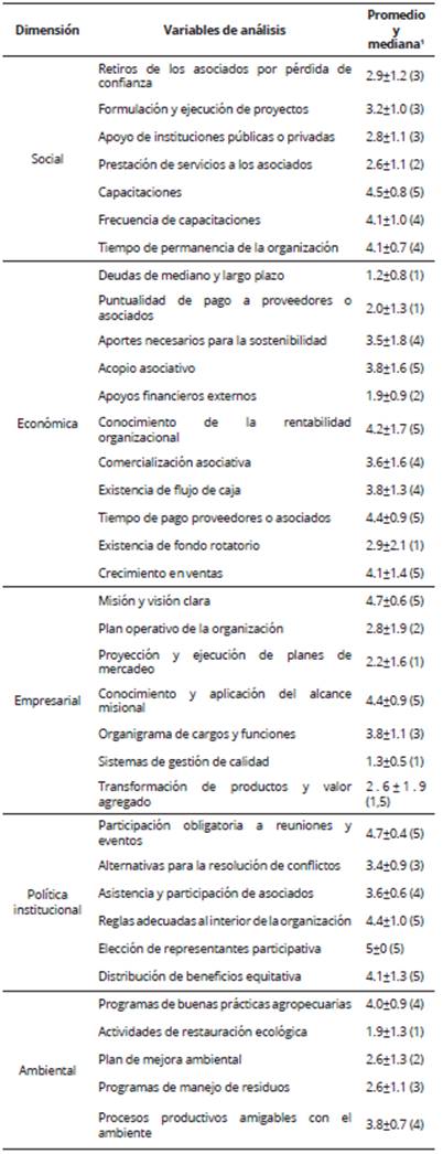 En la Tabla 2 se incluyen las medias y las medianas obtenidas de las variables priorizadas dentro de cada dimensión. La dimensión S se caracterizó por los procesos cognitivos de capacitación y su injerencia en la continuidad del aprendizaje, además de la incidencia de la organización en el mejoramiento de los procesos productivos (promedios > 4.0). Sin embargo, esta dimensión evidenció dificultades en la ejecución de los proyectos, la prestación de servicios y el apoyo institucional, lo que posiblemente ocasionó el retiro de asociados por pérdida de confianza. El promedio de las variables de S fue de 3.46 ± 0.52.