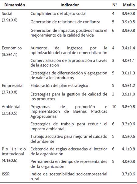 De acuerdo con la metodología utilizada, el ISSR utilizado es un lineamiento posible para la implementación de proyectos de desarrollo rural, por tanto, debe coincidir con el fortalecimiento organizacional (Hashemi y Ghaffary, 2017), donde el principal objetivo de los proyectos de desarrollo rural es lograr la sostenibilidad, lo que incluye el mejoramiento del bienestar socioeconómico de los asociados. Según Hashemi y Ghaffary (2017) la aplicación de índices como el ISSR coadyuva a la evaluación de procesos en vías de desarrollo que están orientados o no en la sostenibilidad, también es necesario abordar múltiples indicadores o grupos de interés, como lo recomendaron Rodríguez et al., (2018) al momento de analizar organizaciones de carácter agropecuario.