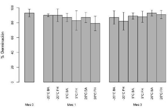 Figura 1: Germinación de Coriandrum sativum almacenadas durante uno y tres meses, en frasco hermético de vidrio (FH) y bolsas de aluminio selladas al vacío (BA) a -20, 5, 20 °C.