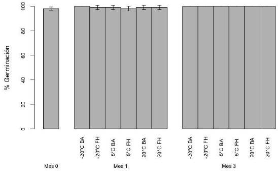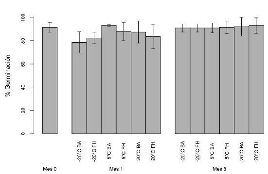 *Semillas almacenadas durante uno y tres meses en frasco hermético de vidrio (FH) y bolsas de aluminio selladas al vacío (BA) a -20, 5, 20°C.