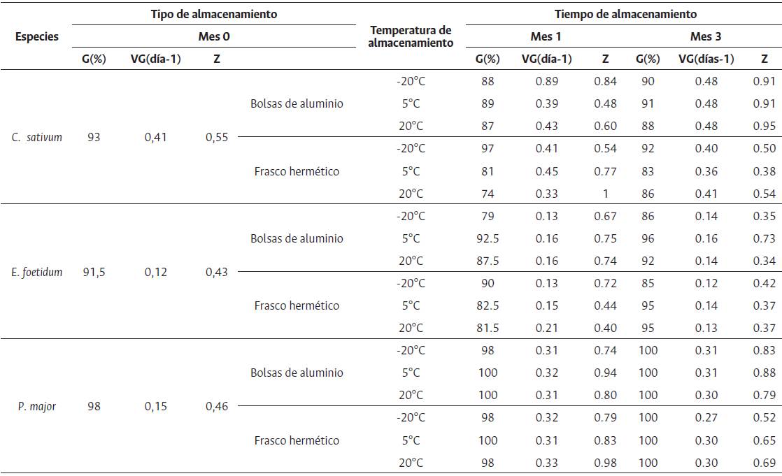 Las semillas de C. sativum, E. foetidum y P. major recién cosechadas y antes de ser almacenadas en cualquier tratamiento tienen un contenido de humedad (CH) bajo y un porcentaje de germinación (G) alto, respectivamente para C. sativum (CH: 11.8 %, G: 93 %), E. foetidum (CH: 13.9 %, G: 91.5 %), y P. major (CH: 9.4 %, G: 98 %).
