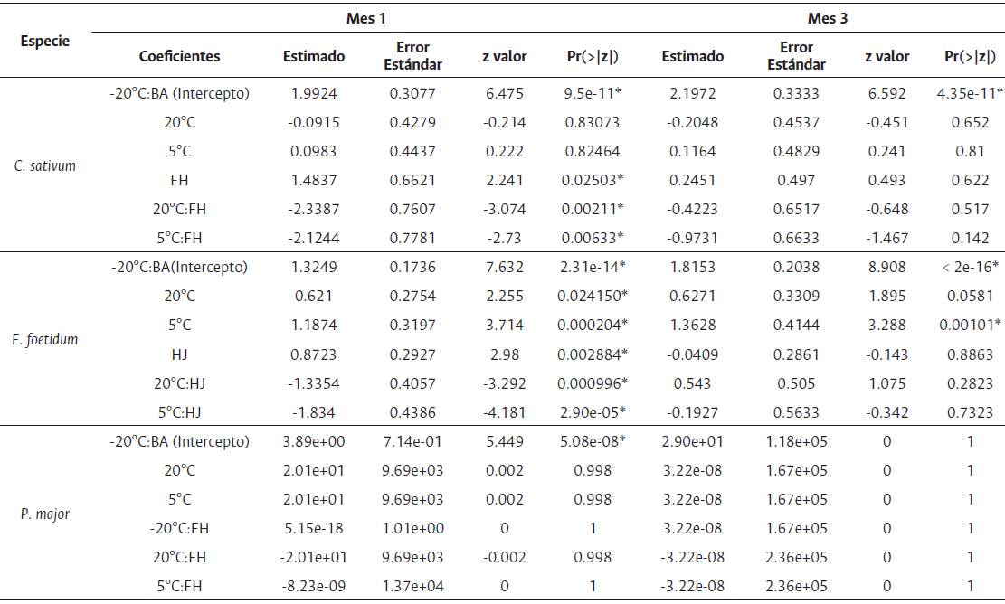 Según los resultados del análisis de GLM de C. sativum hay un efecto positivo sobre la germinación en el frasco hermético de vidrio a -20 °C con un porcentaje de 97 % en el mes uno y 92 % en el mes tres de almacenamiento (Tabla 1; Tabla 2). Mientras que, la interacción entre el almacenamiento en frasco hermético a las temperaturas 20 °C y 5 °C, durante el mes uno, es significativa y negativa (74 % Tablas 1,2). Los estimados del mes tres en todas las interacciones, exceptuando el intercepto, no fueron significativas (Tabla 2) como se muestra también en los valores G que no varían mucho entre sí (Tabla 1). Las semillas de E. foetidum almacenadas en bolsas de aluminio a 5 °C y 20 °C durante tres meses, tienen una germinación mayor y estadísticamente significativa, en comparación con el almacenamiento a -20 °C (Tablas 1, 2). Se observaron interacciones estadísticamente significativas entre la germinación de semillas almacenadas por un mes en frasco hermético a 20 °C, en los cuales la germinación disminuyó (Tablas 1, 2). Después de tres meses de almacenamiento, la germinación es menor, con coeficientes significativos para semillas almacenadas en bolsas de aluminio a -20 °C (86 %) y en frascos herméticos (85 %). En el mes 1, hay un efecto positivo en la germinación de semillas almacenadas a -20 °C en bolsas de aluminio (Tablas 1, 2). La germinación de semillas de P. major almacenadas durante tres meses en frascos herméticos y bolsas de aluminio, en las tres temperaturas, es de 100 % (Figura 3). Los estimadores del análisis no muestran diferencias significativas entre tratamientos, ya que los valores G de esta especie son similares.