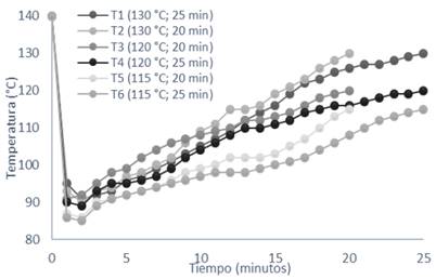 Las curvas del proceso de tostado aparecen en la Figura 1, donde se observa que las muestras contenían porcentajes de humedad próximos a 7%. Este parámetro es determinante en el descenso de la temperatura durante la fase de equilibrio térmico, como se observa para los tratamientos 5 y 6, donde las temperaturas fueron menores y los porcentajes de humedad superiores a los demás tratamientos, lo que demanda mayor transferencia térmica para alcanzar el equilibrio del sistema por efectos de convección de calor.