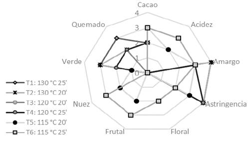 El sabor envuelve el gusto y el aroma, siendo el primero la sensación básica generada por los compuestos no volátiles como dulce, salado, amargo y ácido. El aroma es la sensación dada por los compuestos volátiles constituidos por diferentes estructuras químicas orgánicas que están presentes en los alimentos (Reineccius, 2006). Altas temperaturas y largos tiempos de tostado eliminan la especificidad aromática de los cacaos finos de aroma, favorece el desarrollo de aromas térmicos y posterior sabor a quemado; efecto que fue observado en este estudio con los tratamientos 130° y 120 °C (Figura 2), en los cuales el amargo, la astringencia, y el quemado fueron los sabores destacados, siendo defectos intensos que camuflaron los sabores específicos propios de la pasta de copoazú y que son altamente valorados por los industriales del cacao a nivel mundial, lo que deterioró la calidad sensorial de las muestras.