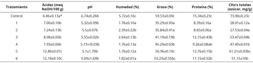 El análisis ANOVA multifactorial para las variables acidez, proteína y carbohidratos totales, mostró diferencias significativas (P < 0.05) para los tratamientos tiempo y temperatura, generando tres grupos homogéneos en la prueba LSD. Los análisis estadísticos para las variables pH y contenido de grasa mostraron que la temperatura es el factor de mayor incidencia durante esta fase. La variable humedad, por su parte, presentó diferencias significativas (P < 0.05) para el factor tiempo de proceso.