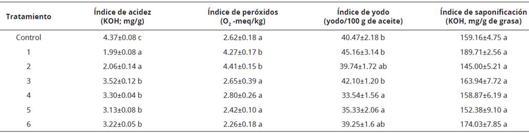 Por sus similitudes filogenéticas con cacao, el copoazú posee contenidos altos de grasa catalogados por algunos autores como de composición superior a aquél (Oliveira y Genovese, 2013). Los contenidos de triglicéridos, terpenos, esteroles y tocoferoles contribuyen a la viscosidad del producto final, la fracción lipídica tiende a ser estable y subsistir el proceso de tostado con sólo cambios menores (Wang y Lim, 2011). En la Tabla 3 se incluyen los resultados de las pruebas de calidad realizadas a la grasa de Copoazú. El índice de acidez mostró valores bajos para los tratamientos a mayor temperatura y tiempo de tostado, observando contenidos de KOH de 1.99 y 2.06 mg/g para los tratamientos 5 y 6, respectivamente, los cuales son menores que los encontrados por Hernández- Bejarano y Calderón (2006) para grasas de copoazú (10.34 mg/g de KOH) y semejantes a los de Moreno et al. (2013) quien encontró índices de acidez entre 1.372 y 3.872 mg/g de KOH para ocho accesiones de copoazú. Por otra parte, el ANOVA, mostró un efecto significativo (P < 0.05) de la temperatura sobre las propiedades evaluadas.