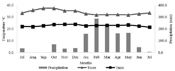 Figure 1: Rainfall and maximum and minimum temperature from July 2013 to July 2014. Data obtained from EMBRAPA Mid-North Meteorological Station, installed at Comvap Factory.