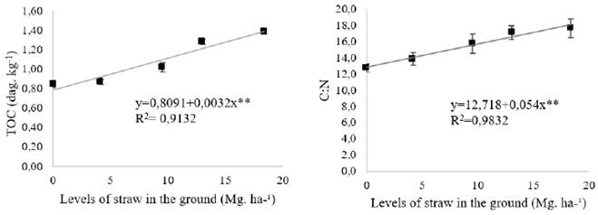 Figure 2: Total Organic Carbon (TOC) (Left) and C:N (Right) ratio of a Plintossol under sugarcane cultivation, after harvest without burning and different straw content in soil. Vertical bars indicate the standard error of the mean (n = 4). ** Significant at 1% probability.
