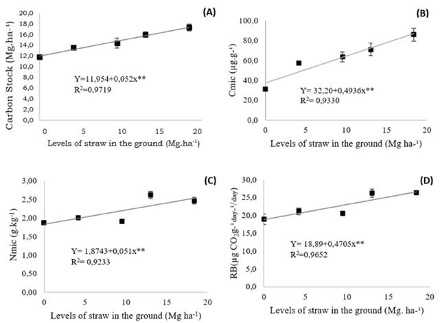 Figure 3: Carbon stocks (A), Carbon contents of microbial biomass (B), microbial biomass nitrogen (C) and respiration (D) of a Plintossol under sugarcane cultivation after harvest without burning and different straw content in soil. Vertical bars indicate the standard error of the mean (n = 4). ** significant at 1% probability.