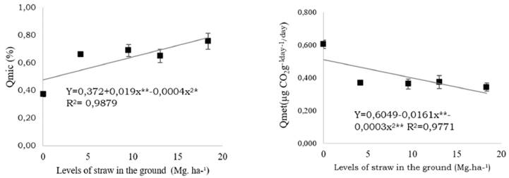 Figure 4: Microbial quotient (Qmic) (Left) and metabolic quotient (Qmet) (Right) of a Plintossol under sugarcane cultivation after harvest without burning and different straw content in soil. Vertical bars indicate the standard error of the mean (n = 4). ** significant at 1% probability. * significant at 5% probability.